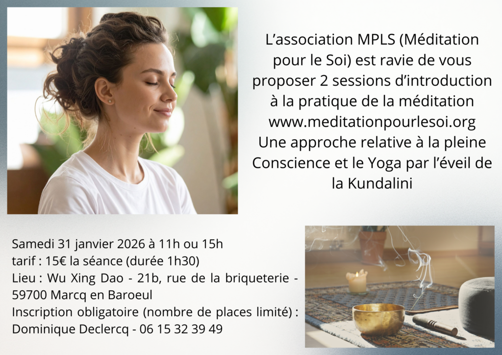 L’association Wu Xing Dao (Qi-Gong et Tai Chi Chuan) a invité notre association MPLS pour 2 sessions d’initiation à la méditation le samedi 31 janvier. Il reste 4 places pour des participants extérieurs à leur association. Le contact pour l’inscription est sur l’affiche.